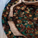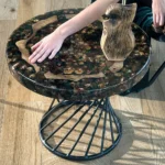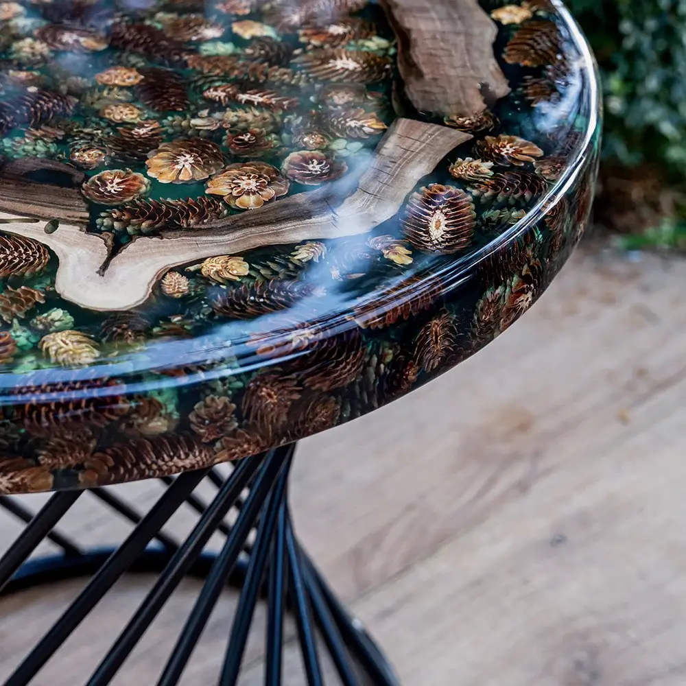 Questo fantastico tavolino personalizzato su richiesta è stato realizzato con pigne di larice essiccate, attorniate dalla radica del noce europeo in abbinamento alla resina verde trasparente.