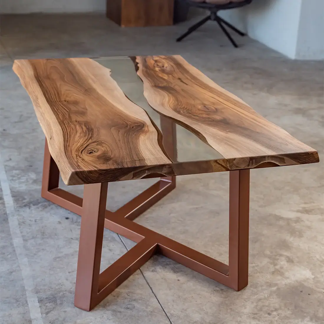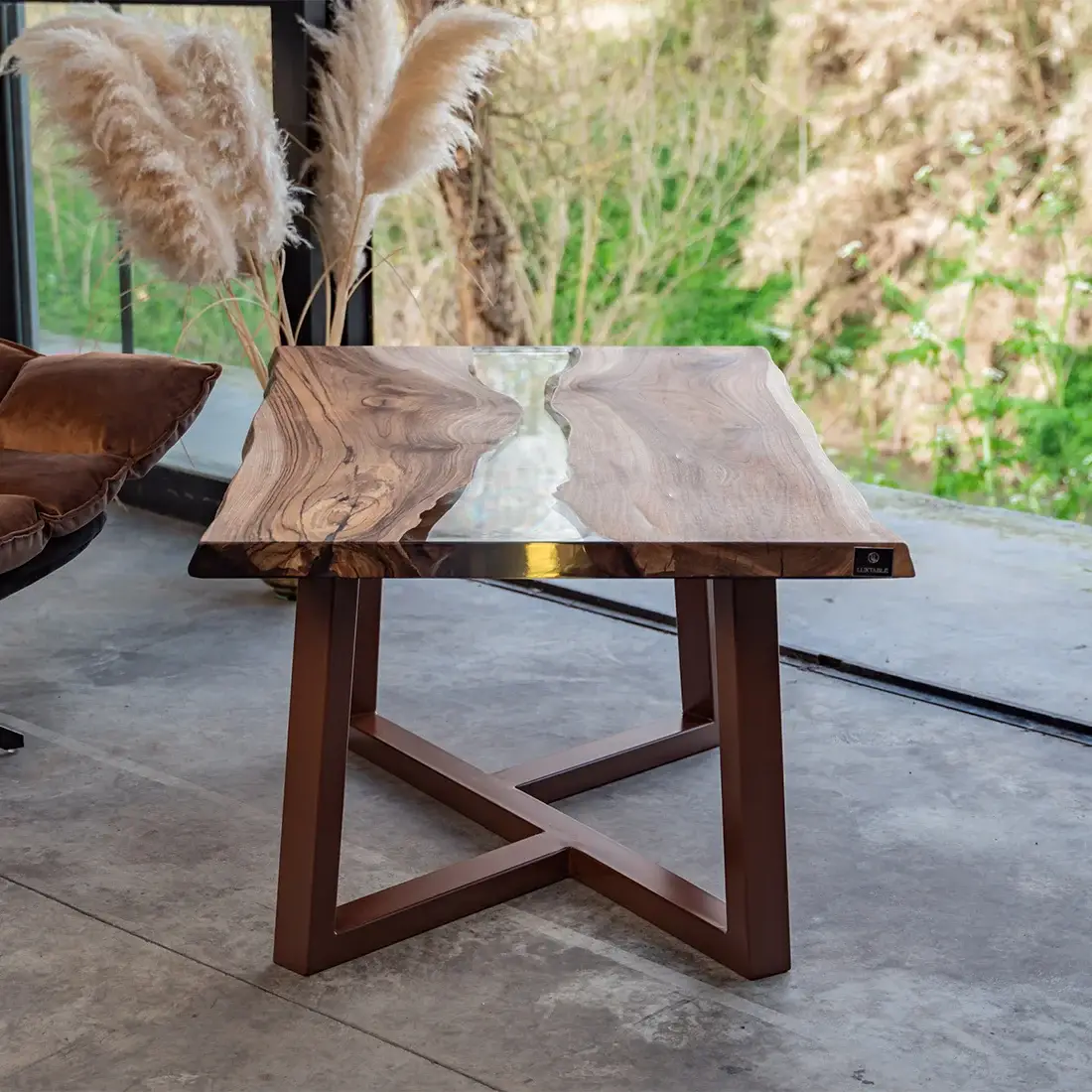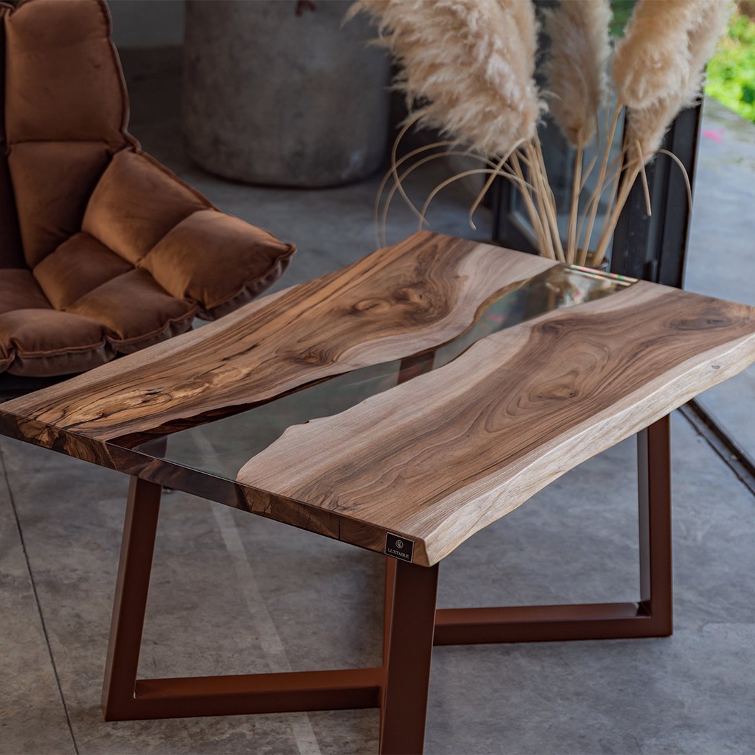 Tavolino da salotto Gloria in noce europeo e resina trasparente lucida