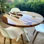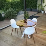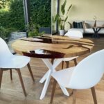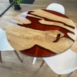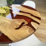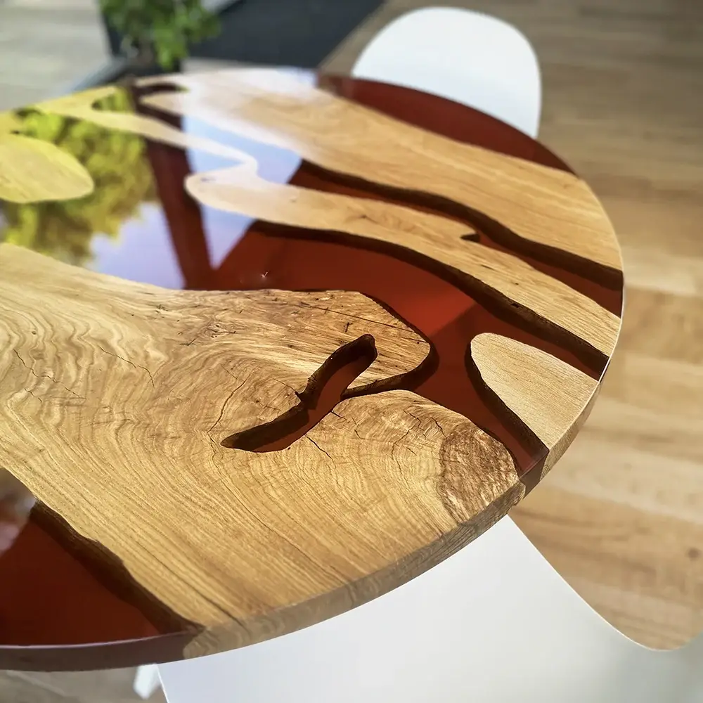 La resina bordeaux lucida è stata applicata al piano del tavolo per aggiungere un tocco moderno e un’elegante nota di colore. La resina bordeaux ha una tonalità intensa di rosso vino, che crea un contrasto affascinante con il rovere antico.