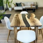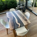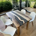 La resina fumè satinata è stata applicata al piano del tavolo, creando un effetto traslucido e affascinante. La resina fumè ha una tonalità sfumata di grigio scuro o marrone, che aggiunge profondità e mistero al tavolo. La finitura satinata conferisce alla resina un aspetto elegante e liscio al tatto, aggiungendo una nota di modernità al design complessivo.