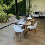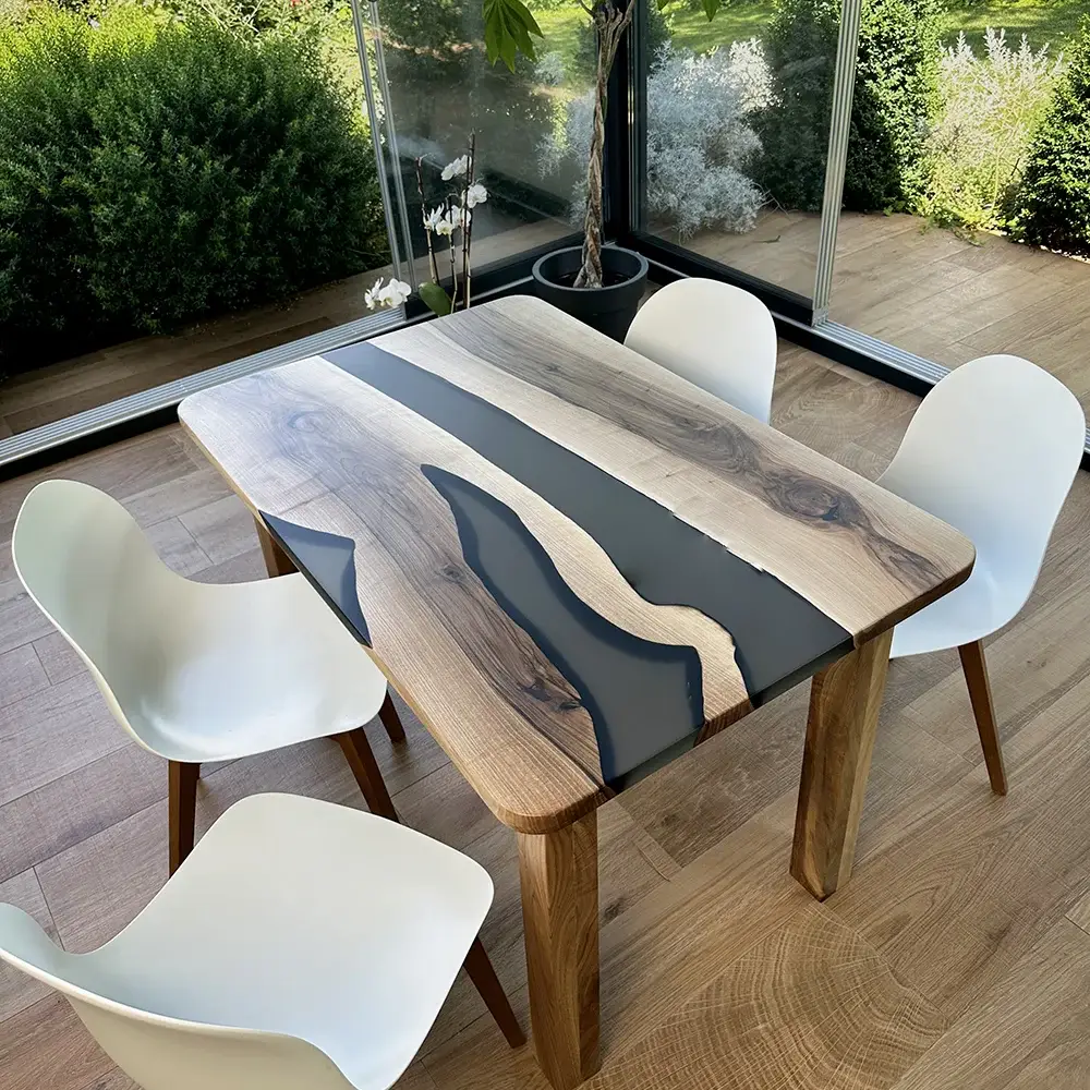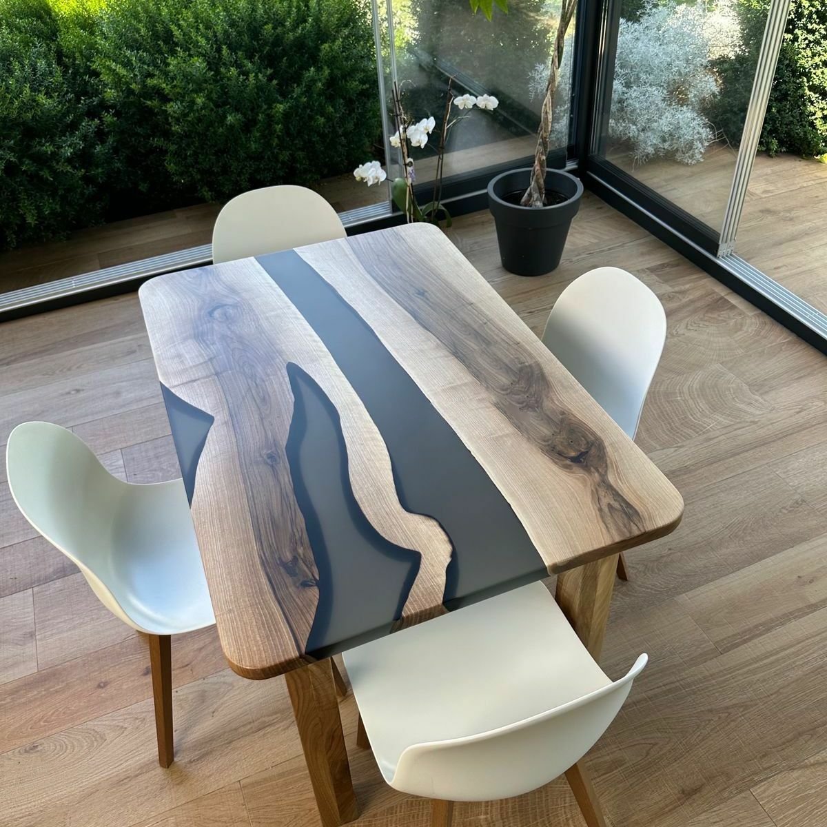 Tavolo da pranzo Iris in noce europeo e resina fumè semitrasparente satinata.