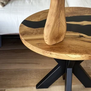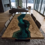 Design unico con effetto fiume in resina epossidica: Ogni tavolo presenta un effetto fiume in resina epossidica unico nel suo genere che evidenzia le venature naturali e i bordi organici del legno.